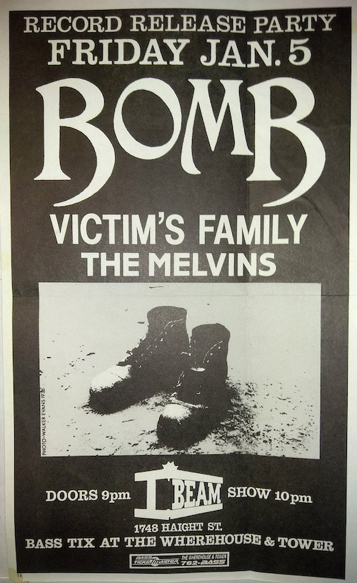 Nirvana were label mates with Bomb through the "Tupelo" imprint distributed outside the United States. Bomb were also on "Boner" records in the U.S.; label mates with Melvins. So there was a connection. Passing through San Francisco, where Bomb and Melvins were based, we always seemed to miss the former's shows. There were stories about crazy performances. I recall King Buzzo telling me of an instance of sex on stage between a Bomb band member and their girl friend at one show! There were also stories of drug abuse that were akin to some things I had heard about another S.F. band, my beloved Flipper. Michael Dean called me once in about 1992 asking to borrow $5,000. I knew the lyric, "Can you wonder, can you holler, can I borrow one more dollar?", and politely declined to loan any money. As my life changed profoundly with the ascent of Nirvana, I had lost track of Bomb (I also became disconnected from myself, or the pre-fame Krist. But this is another story.)
